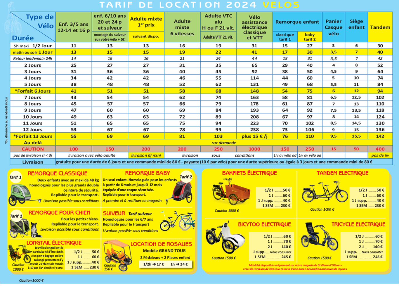 En suivant, l’exemple du vélo enfant de 3/5 ans, le tarif pour une journée passe de ce fait à 13€.